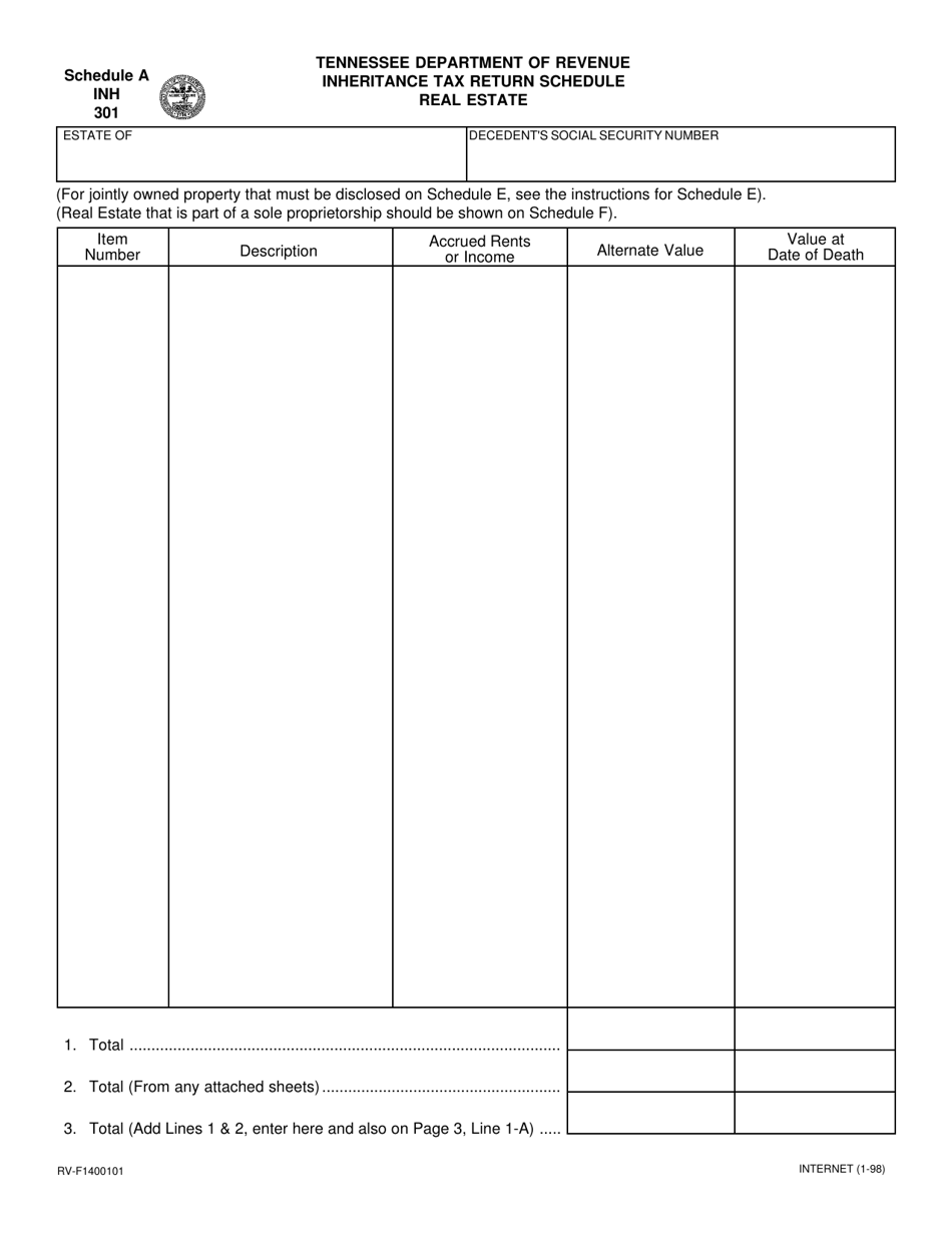 Form Rv F1400101 Inh301 Schedule A Download Printable Pdf Or Fill Online Inheritance Tax Return Schedule Real Estate Tennessee Templateroller